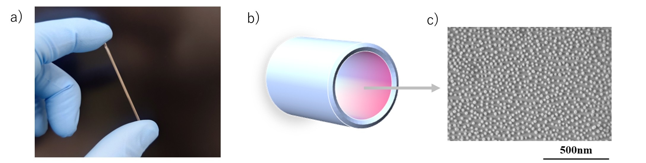 Figure 1: a) Photo of capillary b) Schematic diagram of capillary c) Electron microscope image of inner wall