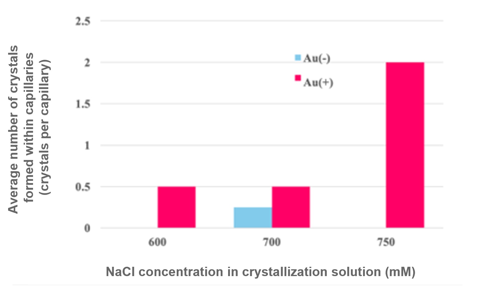 As the graph shows, the number of crystals that formed was higher for capillaries with Au nanostructures (the red bars on the graph).