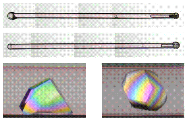 Figure 2: Top) Protein crystals formed in capillaries containing crystallization solution