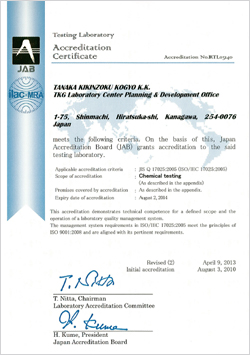 ISO/IEC 17025 is the international standard that defines the general requirements for competence in examination or calibration. TANAKA has obtained ISO/IEC17025 accreditation for its analytical techniques with platinum, gold, silver and palladium, the precious metals it deals with most.