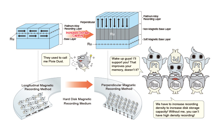 To increase hard disk storage, the density of magnetic signals in the planar direction used to be increased. When density increased too much though, data storage stability suffered. As a solution, magnetic storage signals were applied perpendicularly to further increase storage density. A base layer of ruthenium under the recording layer was an essential development towards the success of this perpendicular magnetic recording method.