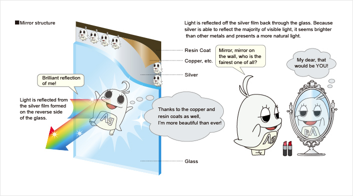 A mirror is created by applying a film of silver to the reverse side of a glass. Protective coats of copper and resin are then applied over the silver film.When we look at ourselves in a mirror, we are actually seeing light reflected from the silver film through the sheet of glass. Because silver is able to reflect the majority of visible light, it seems brighter than other metals and presents a more natural light.