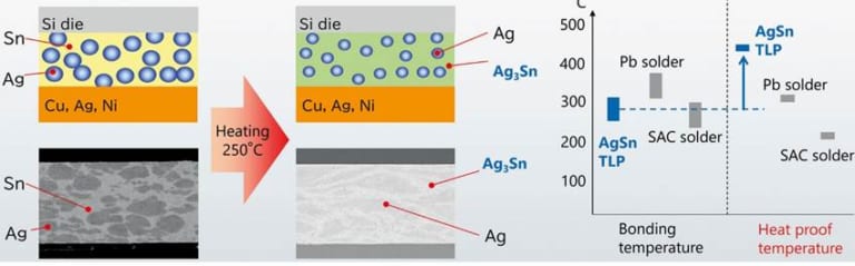 Semiconductor devices—including power semiconductors—require high heat resistance as high temperatures may cause failures or shorten lifespans. In addition, the primary bonding materials currently adopted in the manufacturing of power semiconductor packages generally include high-lead solder which is being replaced with other materials due to its impact on the environment (Although lead is under the scope of regulation by the RoHS Directive, use under a validity period is allowed for applications for which substitutes are not possible scientifically or technically. However, the development of substitutes is underway due to exclusion under the validity period), SAC solder (SAC solder is a solder material that contains tin, silver, and copper). which has low heat resistance, and silver (Ag) sintering agents. The heating temperature of this product is 250 °C, allowing transient liquid phase diffusion bonding. Transient liquid phase diffusion bonding, also known as TLP bonding, is a bonding method that temporarily melts and liquifies metals and such inserted in the bonding surface, then uses diffusion to bond through isothermal solidification when carrying out diffusion bonding. As the heat-resistance temperature rises to 480 °C after bonding, it has higher heat resistance than existing products. It can also be used with various types of bonded materials, as it can maintain a bonding strength of up to 50 MPa. Furthermore, this product is a lead-free bonding material, and it also features high bonding reliability that has passed heat cycle testing of 3,000 cycles.