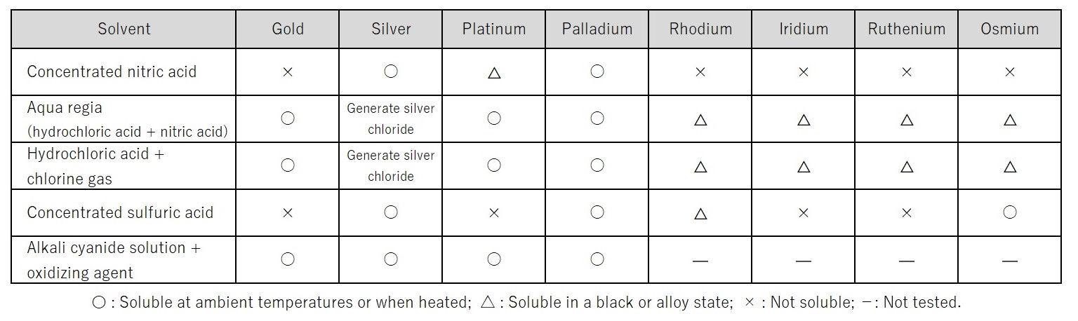First stage: Liquefaction partly overlaps with the liquefying treatment in the assessment process for wastes. In the recovery and refining processes, liquefaction is the process of dissolving precious metals contained in powder or ingots in a chemical agent to ionize them. A suitable chemical agent is chosen from nitric acid, aqua regia (hydrochloric acid + nitric acid) and cyanogen-containing liquid according to the types/composition of the precious metals (Table 1). A strong oxidizing agent is used to dissolve precious metals that are chemically stable materials. As needed, other metals are added to the waste material to adjust its composition so that it becomes more dissolvable in a chemical agent.