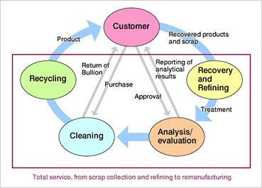 A person in charge from TANAKA noted that recycling generates profits in some cases. TANAKA proposed a solution for recycling the precious metals, called funds flow, in which precious metals are recovered from urban mines made up of the scrap generated at the production site as well as the waste products that have reached the end of their product life cycles, which are then recycled to restore their values.